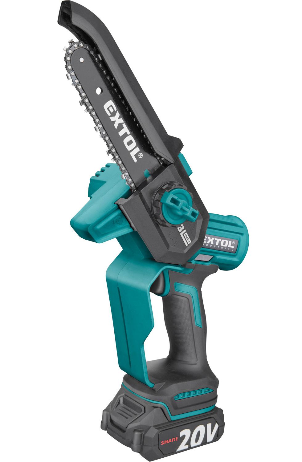 Az Extol® Industrial SHARE 20 V akkus programba tartozó egykezes akkus láncfűrésszel kertben, erdőben, műhelyben stb. lehet faanyagokat, gallyakat, vékonyabb fatörzseket, bokrokat stb. fűrészelni.
