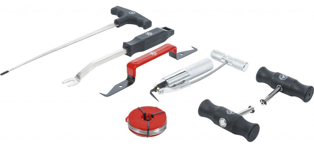 - 7 darabos speciális szélvédőkivágó készlet, minden olyan szerszámmal, mely a szélvédő kiszereléshez, üvegragasztó eltávolításához szükséges.