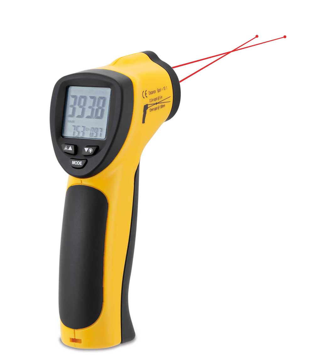Infravörös hőmérsékletmérő műszer dupla lézerpontos tájolással. Kis méretéből adódóan akár zsebben is elfér.